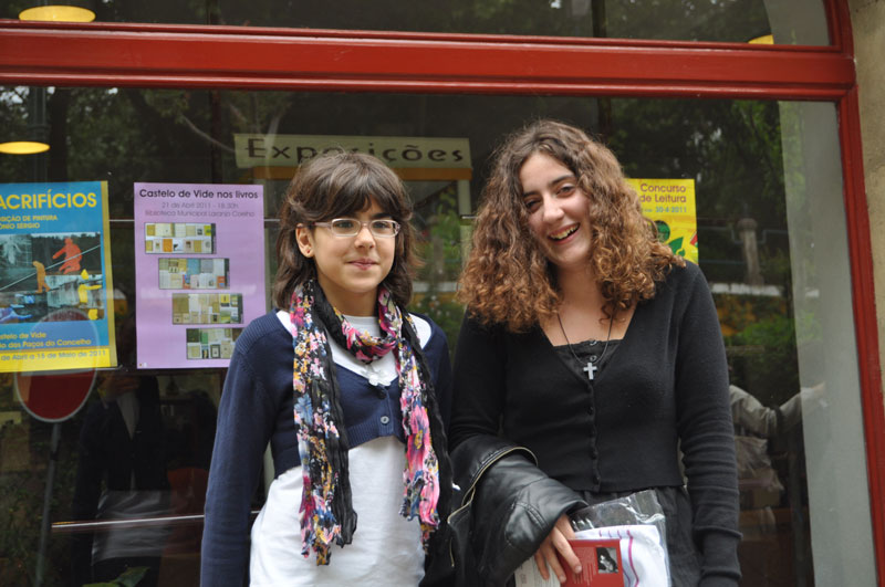 | A Mariana e a Catarina junto à Biblioteca Municipal |