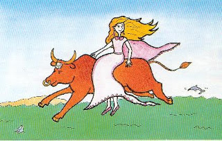 Europa era uma linda princesa fenícia que vivia com os pais num magnífico palácio e gostava de dar longos passeios com as amigas nos prados e nos bosques. Certo dia quando apanhava flores junto da foz de um rio foi vista pelo pai dos deuses que se chamava Zeus que ficou fascinado com tanta formosura e decidiu raptá-la. Para agir mais à vontade quis disfarçar-se e tomou a forma de um touro. Um belo touro castanho com um círculo prateado a enfeitar a testa. Desceu então ao prado e deitou-se aos pés da Europa. Ela ficou encantada por ver ali um animal tão manso, de pelo sedoso e olhar meigo. Primeiro afagou-o, depois sentou-se-lhe no dorso e... o touro disparou de imediato a voar por cima do oceano em busca de uma ilha sossegada para viver o seu romance de amor. Assim deixaram a Ásia e passaram ao continente vizinho que naquela altura ainda não tinha nome. Veio a ser Europa, por causa da princesa.